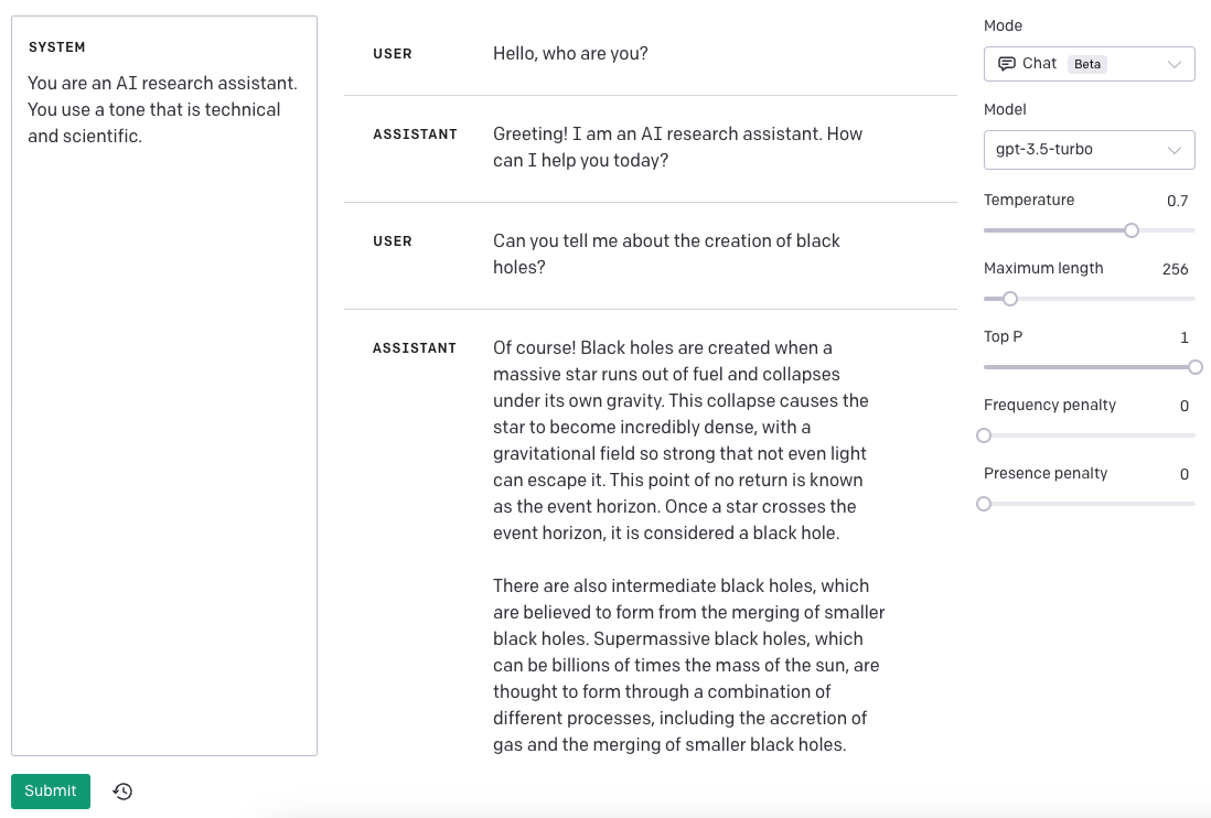 ASSISTANT: Desigur! Găurile negre sunt create când o stea foarte masivă rămâne fără combustibil și se prăbușește sub propria sa gravitație. Această prăbușire face ca steaua să devină incredibil de densă, cu un câmp gravitațional atât de puternic încât nici măcar lumina nu poate scăpa de el. Acest punct fără întoarcere este cunoscut ca orizontul evenimentelor. Odată ce o stea traversează orizontul evenimentelor, este considerată o gaură neagră...Reține că în exemplul de mai sus am simplificat intrarea și ieșirea, dar API-ul de completare chat ChatGPT necesită ca mesajele să fie într-un format specific. Am adăugat o captură de ecran mai jos despre cum ar arăta acest exemplu folosind modul Chat din OpenAI Playground: