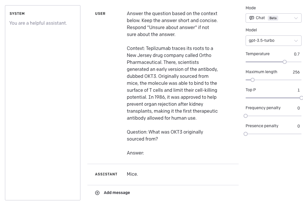 Formatul de chat permite conversații multi-turn, dar de asemenea suportă sarcini single-turn similar cu ceea ce am folosit cu text-davinci-003. Aceasta înseamnă că putem folosi ChatGPT pentru a executa sarcini similare cu ceea ce am demonstrat pentru modelele GPT originale. De exemplu, să încercăm să executăm următoarea sarcină de întrebare-răspuns folosind ChatGPT: